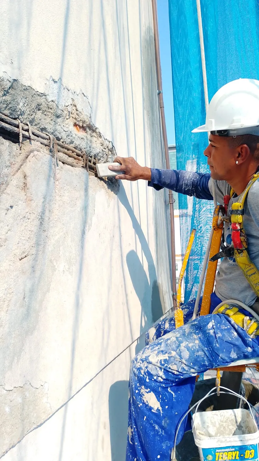 O processo inclui análise técnica, reparos estruturais, limpeza, aplicação de revestimentos e tratamento de fissuras, corrigindo degradações causadas por infiltrações, desgaste natural e intempéries.